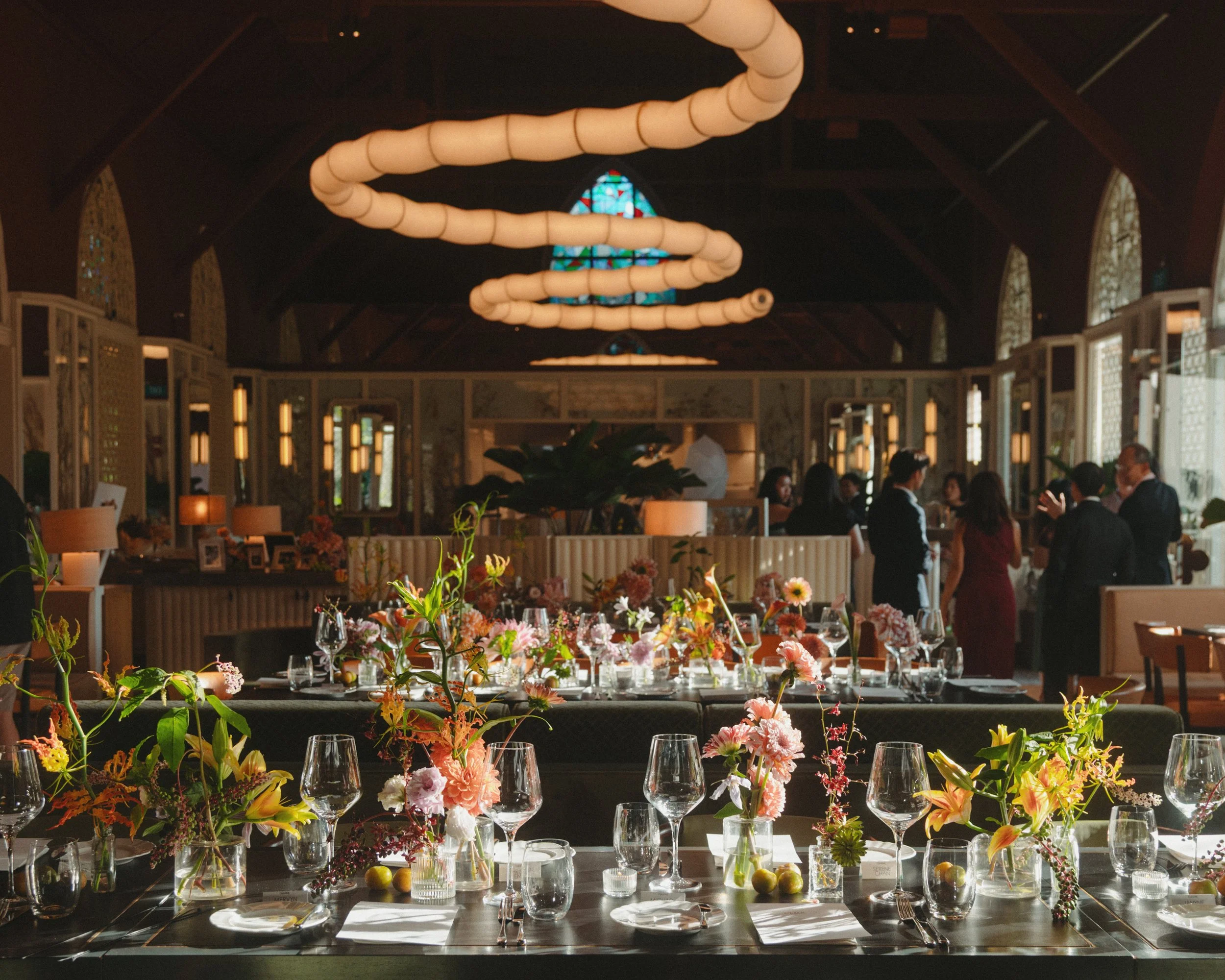 A grand dining hall housed within a restored 1930s chapel—where heritage charm meets a lively, convivial atmosphere for celebrations of every scale.